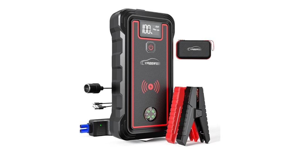 El cargador de batería más completo es de la marca Yaber y ofrece múltiples ventajas. Proporciona una corriente máxima capaz de arrancar un automóvil en tan solo unos segundos. Su banco de energía es de 23800 mAh y cuenta con puntas de acero inoxidable afiladas y endurecidas con las que además podrás romper las ventanas del coche en caso de emergencia. Gracias a su cable inteligente con sistema de protección 8 podrás sujetar las abrazaderas con total seguridad.