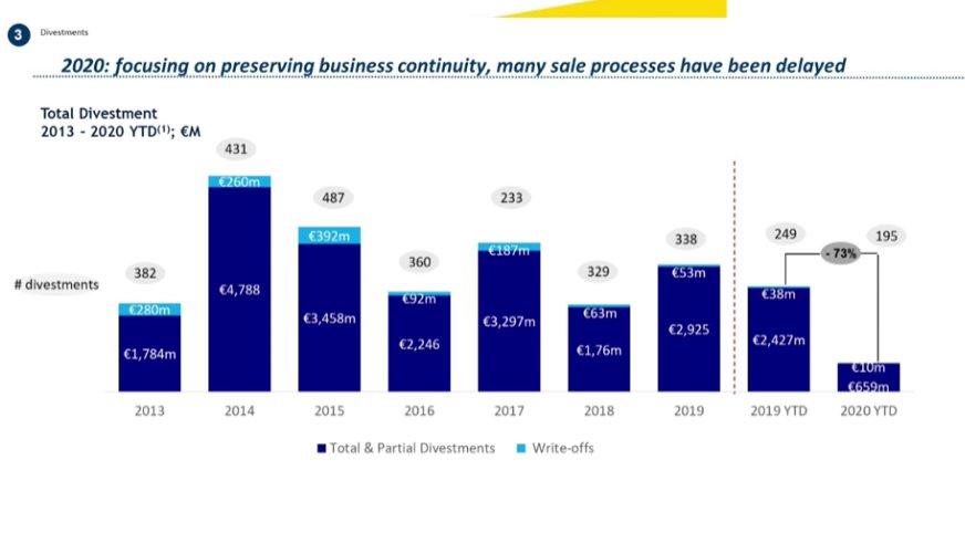 En el lado opuesto de la balanza, el de las desinversiones, el volumen alcanzado a 30 de septiembre de 2020 fue de 669,4 millones de euros (a precio de coste) tras el cierre de 195 desinversiones. Supone un descenso del 73% respecto a 2019 en esta parcela, con muchas de estas salidas esperando tiempos mejores para culminarse. El 65,6% de dicha cantidad fue desinvertido mediante la fórmula de Venta a terceros, el 16,5% “Venta a otra entidad de Capital Privado” y el 7,7% como “Reembolso de préstamos”.