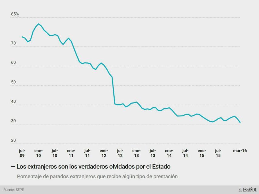 ¿Es cierto que los parados extranjeros se llevan una buena parte de los recursos que deberían corresponder a los españoles? Esta es una idea extendida en algunos sectores de la población, pero los datos demuestran que la realidad es muy diferente. Exactamente, está en el extremo opuesto, tanto que el colectivo de desempleados no españoles nunca estuvo tan desprotegido. El porcentaje de parados extranjeros que están cobrando algún tipo de prestación por desempleo cayó hasta el 30,96%, el dato más bajo desde que existen datos, a partir de julio de 2009.