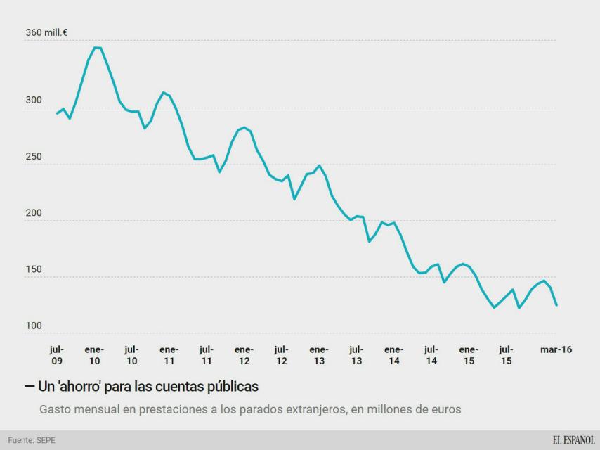 El Estado ha conseguido ahorrar mucho dinero a medida que los parados extranjeros iban encontrando empleo, saliendo de España o bien cuando perdían cualquier tipo de prestación. En concreto son 291.725 beneficiarios menos, un descenso del 60%, lo que ha permitido al Estado rebajar el gasto en prestaciones un 63%.