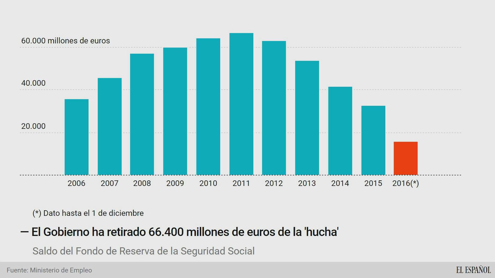 Apenas queda tiempo. El Fondo de Reserva de la Seguridad Social (conocido popularmente como hucha de las pensiones) se agotará definitivamente en el año 2017, a menos que el Ministerio de Empleo y Seguridad Social apruebe medidas urgentes para elevar los ingresos del sistema. El Gobierno, que este jueves ha sacado 9.500 millones de euros para pagar la extra de Navidad a los pensionistas, ha retirado ya 66.401 millones de euros del Fondo desde el año 2012.