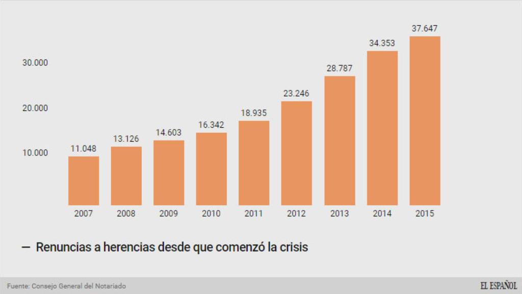 "La causa fundamental es la crisis económica, ya que se han dado muchos casos en los que las deudas hereditarias superan al activo hereditario", explica a EL ESPAÑOL el decano del Colegio Notarial de Castilla y León, José Ángel Tahoces. Si en 2007 la cifra era de 11.047 renuncias, en 2015 el número llega hasta 37.647.
