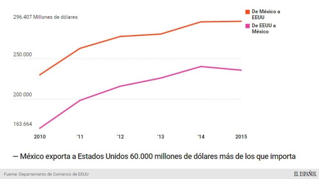 Así, el presidente de Estados Unidos ha denunciado varias veces que su país registra cada año un déficit comercial con México que se sitúa en cerca de 60.000 millones de dólares, una cifra que se desprende de los datos oficiales de los primeros 11 meses de 2016.