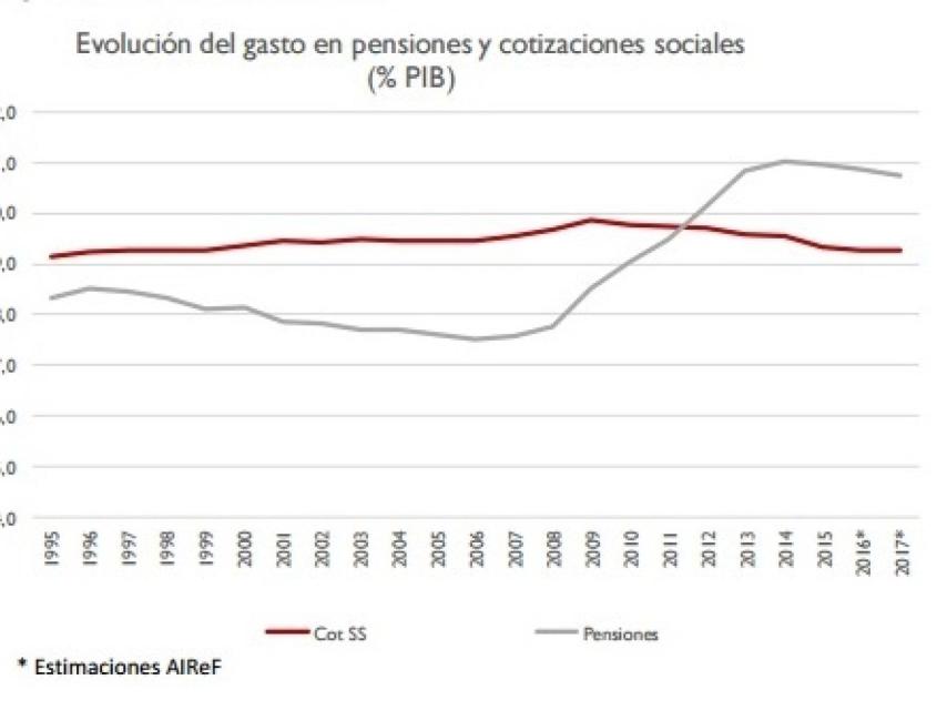 A corto, el déficit de la Seguridad Social en 2016 fue del 1,7% del PIB y se mantendrá igual en 2017 si no se adoptan medidas adicionales. Este déficit es fruto del gasto creciente en pensiones y de la estabilización de los ingresos por cotizaciones.