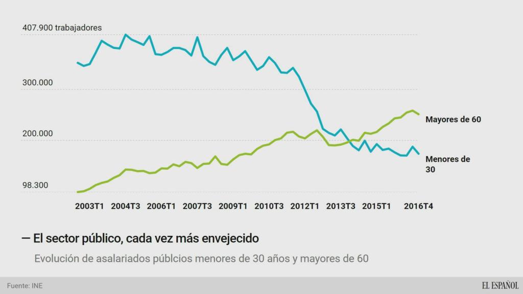 Las estadísticas muestran una clara tendencia de envejecimiento en detrimento de la incorporación de personal joven a las administraciones públicas. En concreto, según los datos recogidos en la Encuesta de Población Activa (EPA), el número de trabajadores mayores de 60 años en el sector público ha aumentado en un 62% desde el año 2008 hasta el cierre del pasado año. Por otro lado, la presencia de jóvenes menores de 30 años en el conjunto de las Administraciones se ha visto mermada en un 51% en el mismo periodo. Antes del estallido de la última gran crisis económica, el número de empleados por debajo de la treintena estaba en 350.000 trabajadores. Sin embargo, en el último trimestre de 2016, esta cifra había descendido hasta los 173.000 empleados. Es una de las consecuencias de la tasa de reposición, que ha limitado la contratación de nuevos funcionarios.