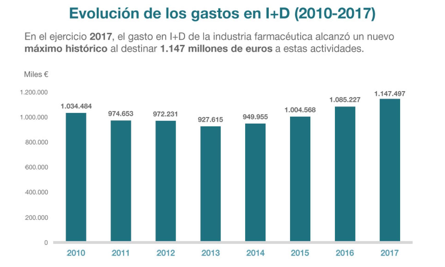 En Europa, la industria farmacéutica destina un total de 35.000 millones de euros al I+D y nuestro país se ha visto respaldado por las altas cifras destinadas a la investigación. Los datos recogidos por Farmaindustria en El valor del medicamento desde una perspectiva social advierten del récord batido por la industria farmacéutica en su inversión en I+D en España. En 2017 creció un 5,7%, alcanzando la cifra histórica de 1.147 millones de euros y confirmando una tendencia al alza que se inició en 2014. La industria farmacéutica española es el primer sector industrial y el tercero de la economía que más invierte en I+D.