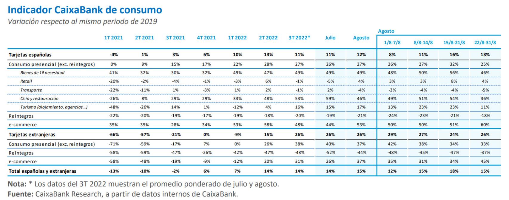Con todos estos datos, el indicador CaixaBank de consumo creció un 14% en los dos meses de verano y marcó el mismo registro que en el segundo trimestre de 2022. La diferencia es que en esta ocasión, fue el gasto con tarjetas extranjeras lo que permitió sostener el dato.