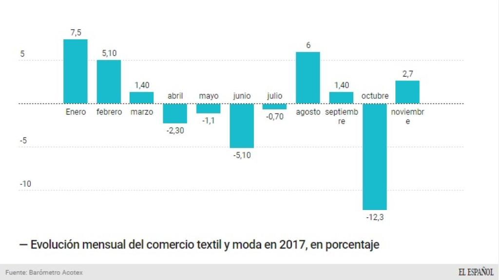 Acotex, la patronal del textil que representa a más de 800 empresas de nuestro país, lo tiene claro. Mientras en octubre cayeron las ventas un 13% en el conjunto de España, según sus cálculos esa cifra descendió hasta más de un 30% en Cataluña. "En un mes como el que se vivió, la gente no tiene ánimo para salir a comprar", explica a este periódico el presidente de Acotex, Eduardo Zamácola, que apunta además a una presión sobre los potenciales clientes: "Si alguien entraba a las tiendas, desde fuera le recriminaban comprar en un momento como ese", asegura.