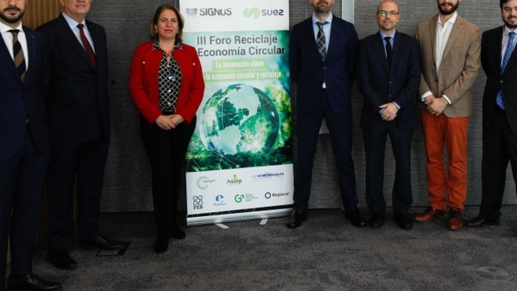 Foto de familia del III Foro Reciclaje y Economía Circular, organizado por EL ESPAÑOL. De izquierda a derecha: Manuel Domínguez, director general de Repacar; Gabriel Leal, director general de SIGNUS; Alicia García-Franco, directora general de FER; Rafael Serrano Pastor, director de Relaciones Institucionales, Marketing y Comunicación de la Fundación ECOLEC; Gustavo Calero, director de RSC, Desarrollo Sostenible e Innovación en SUEZ; Nicola Cerantola, formador y experto en Economía Circular y Arturo Criado, jefe de Empresas y Medios de EL ESPAÑOL.