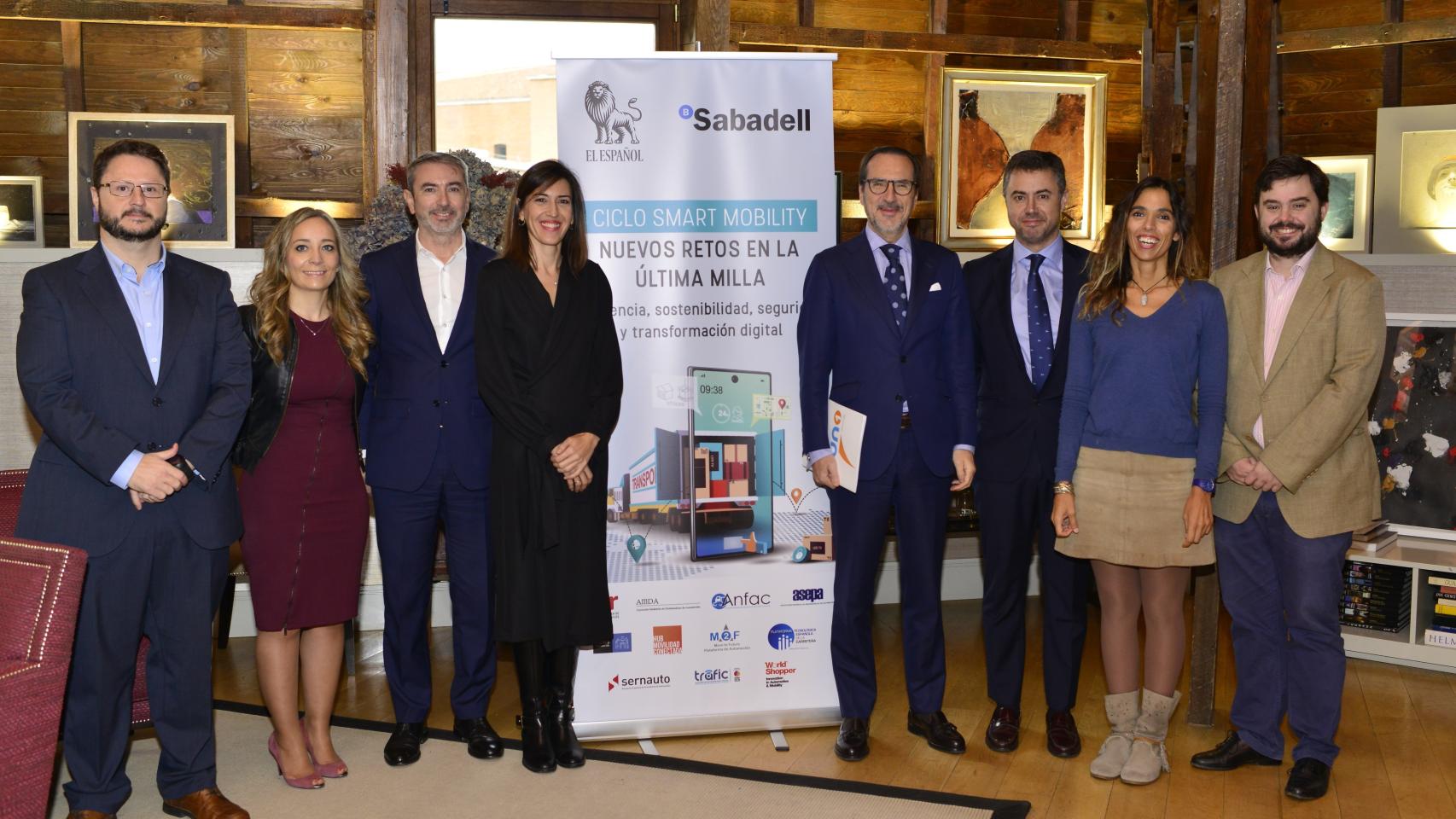 Mesa redonda del Ciclo Smart Mobility. Nuevos retos en la última milla. De izquierda a derecha: Inês Drummond Borges, directora de Marketing en España y Portugal de Worten; Marc Bayo, gerente de SEUR Now; Francisco Aranda, presidente de UNO; Arturo Criado, redactor Jefe de Empresas y Medios de EL ESPAÑOL, Xavier León, Director de Renting y Leasing de Banco Sabadell; Arancha García, directora del Área Industrial y Medio Ambiente de ANFAC; Olga Lozano del Prado, Subdirectora de aparcamientos A.G. Medio Ambiente y Movilidad del Ayuntamiento de Madrid y Ramón Ledesma, Asesor de Pons