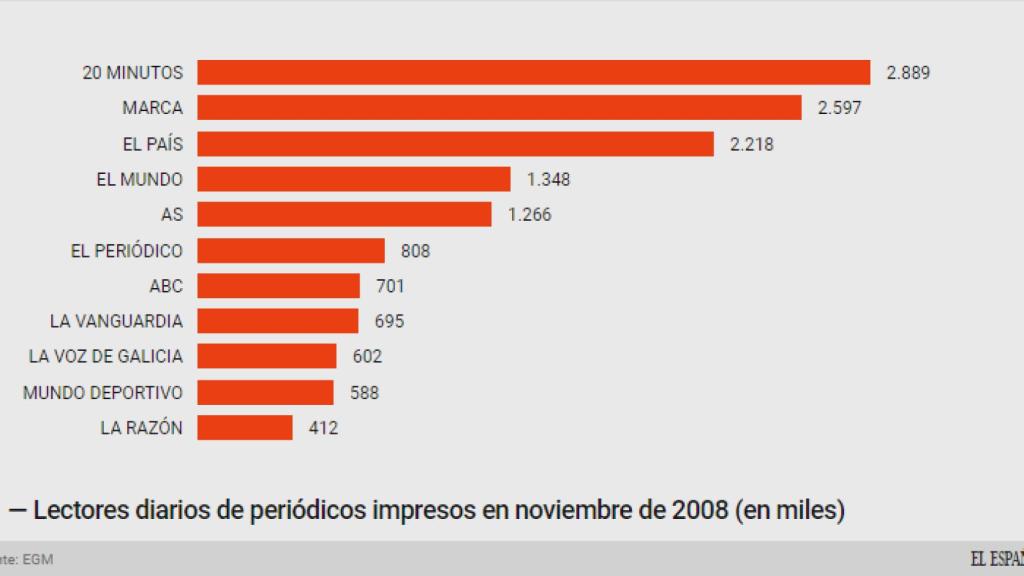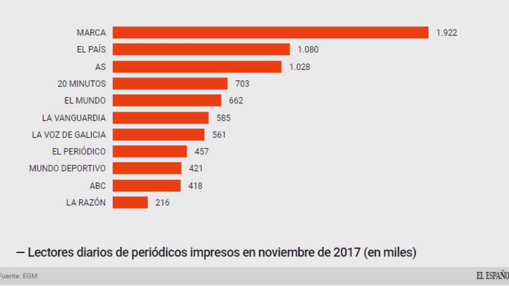 La prensa deportiva es la que menos ha acusado esta caída. El diario Marca sigue siendo el más leído una década después pese a los vaivenes del sector. El deportivo de Unidad Editorial registró 2,5 millones de lectores en noviembre de 2008 y hoy tiene 1,9 millones, un 26% menos. Su más cercano perseguidor es El País, pero a una distancia de más de 900.000 lectores.