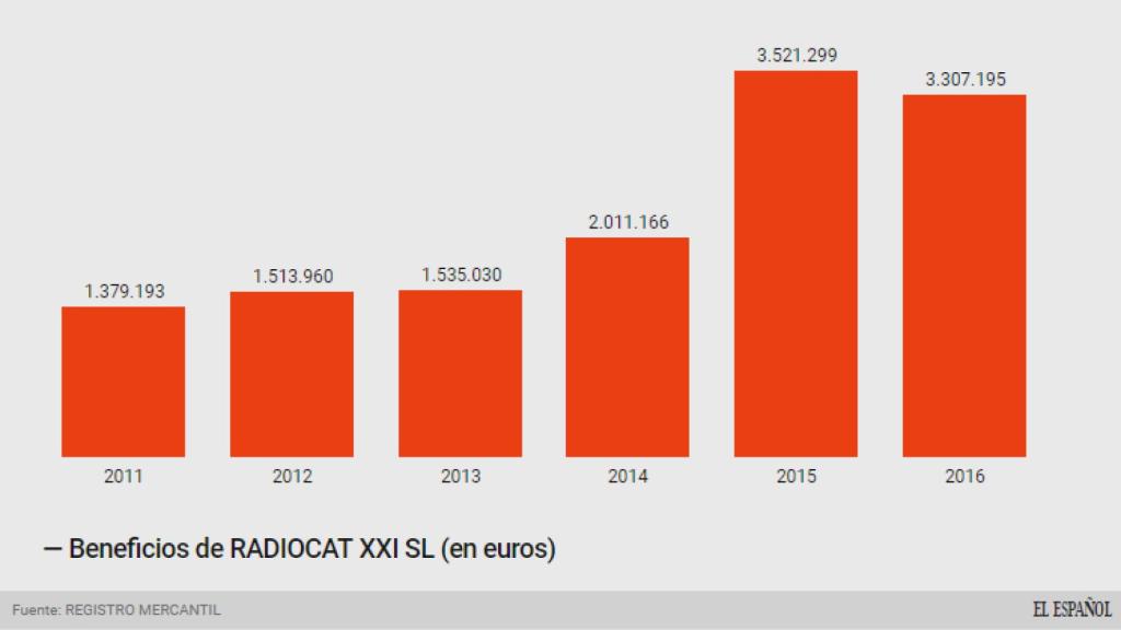 Los documentos remitidos al Registro Mercantil, a los que ha tenido acceso EL ESPAÑOL, reflejan que este crecimiento ha sido exponencial. De esta manera, en 2011, durante el primer año de gobierno de Artur Mas, la emisora ganó 1,37 millones de euros, una cifra que se elevó hasta los 3,3 millones en 2016, ya con Carles Puigdemont como Presidente catalán. En seis años de gobierno independentista Rac1 casi triplicó sus beneficios.