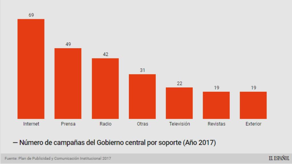 En el informe de ejecución de 2016 (el último publicado) se refleja que dentro los 100,8 millones que Moncloa invirtió durante ese año en publicidad institucional, 32 millones fueron a parar a la televisión. En este plan solo se incluyeron 21 campañas institucionales en el soporte, por las 36 de 2018. Por tanto, es bastante probable que durante este año las cadenas superen largamente estos ingresos.