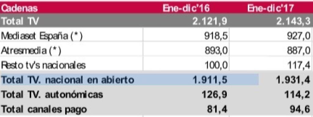 Gran parte de este control del mercado se debe al duopolio publicitario de Mediaset (927 millones) y Atresmedia (887 millones) que se quedaron con el 84,7% del mercado, una pérdida de menos de un punto en un año pese a la arremetida de las cadenas de pago y de las pequeñas TDT. Si analizamos sólo las televisiones en abierto, el duopolio crece hasta el 94,9% de la tarta publicitaria.