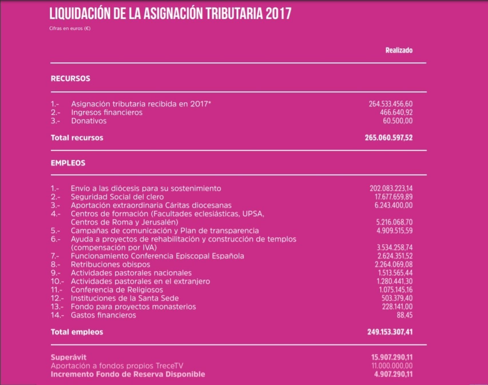 El superávit de las cuentas de los obispos que se destinó a Trece TV -cuyos ingresos son casi exclusivos de la casilla de la Renta que pagan todos los españoles voluntariamente- lo convierte en el tercer gasto más relevante para la Iglesia española. De acuerdo a sus propias cuentas, el dinero que recibe la cadena de televisión (20 millones entre 2016 y 2017) está solo por debajo de lo destinado a las diócesis para su sostenimiento (403 millones) y de la Seguridad Social del clero (33,9 millones).