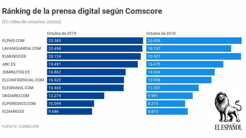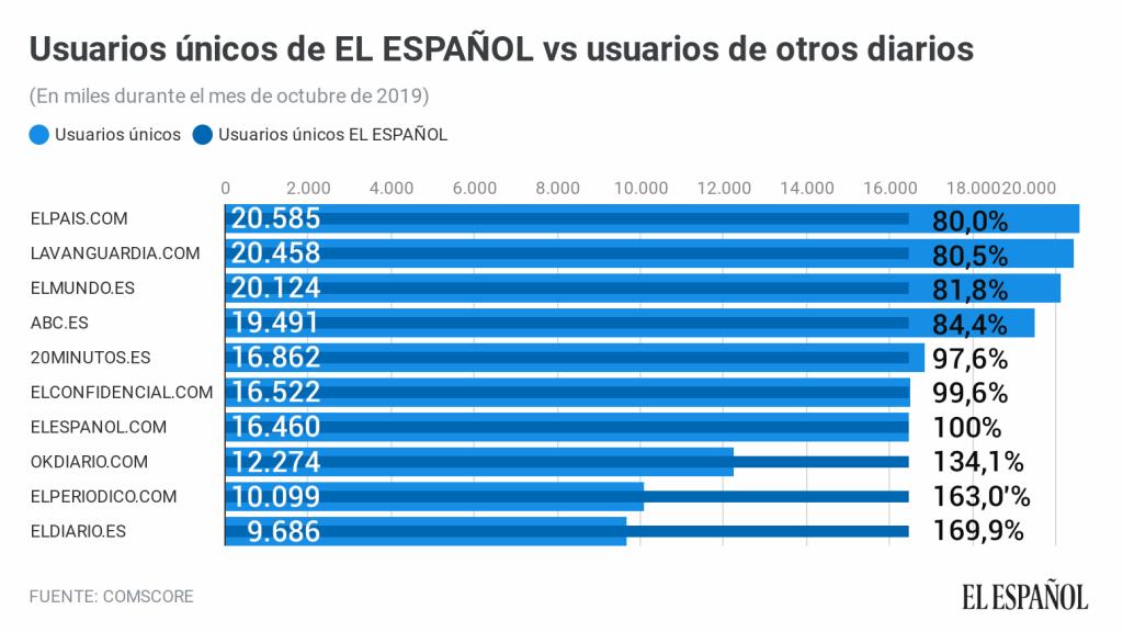 De esta manera, las cifras de octubre 2019 reflejan que los 16,5 millones de visitantes únicos de EL ESPAÑOL suponen ya el 80% de los que tiene ELPAIS.COM (20,5 millones visitantes únicos), el nuevo líder digital; el 80,5% de los 20,4 millones de visitantes únicos de LAVANGUARDIA.COM y el 81,8% de los 20,1 millones de visitantes únicos de ELMUNDO.ES.