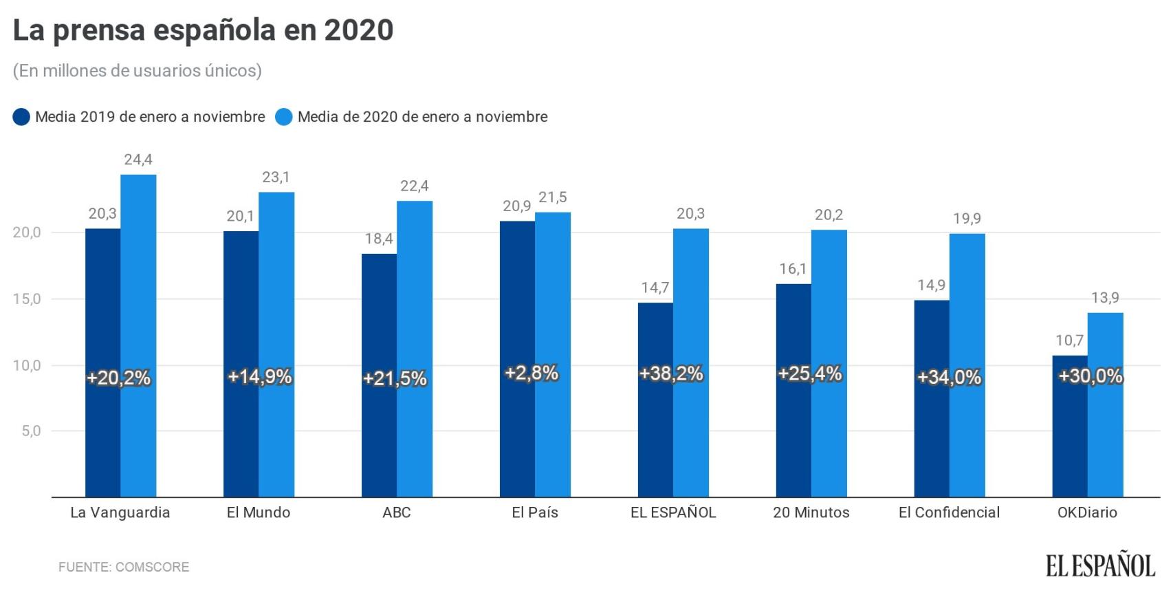 EL ESPAÑOL registró una media anual de 20.321.000 de usuarios únicos en los primeros once meses del año -desde enero a noviembre-, los últimos datos disponibles en Comscore, lo que le sitúa como el diario que más lectores ha ganado en comparación a los primeros once meses de 2019, entre los ocho primeros del ranking.
