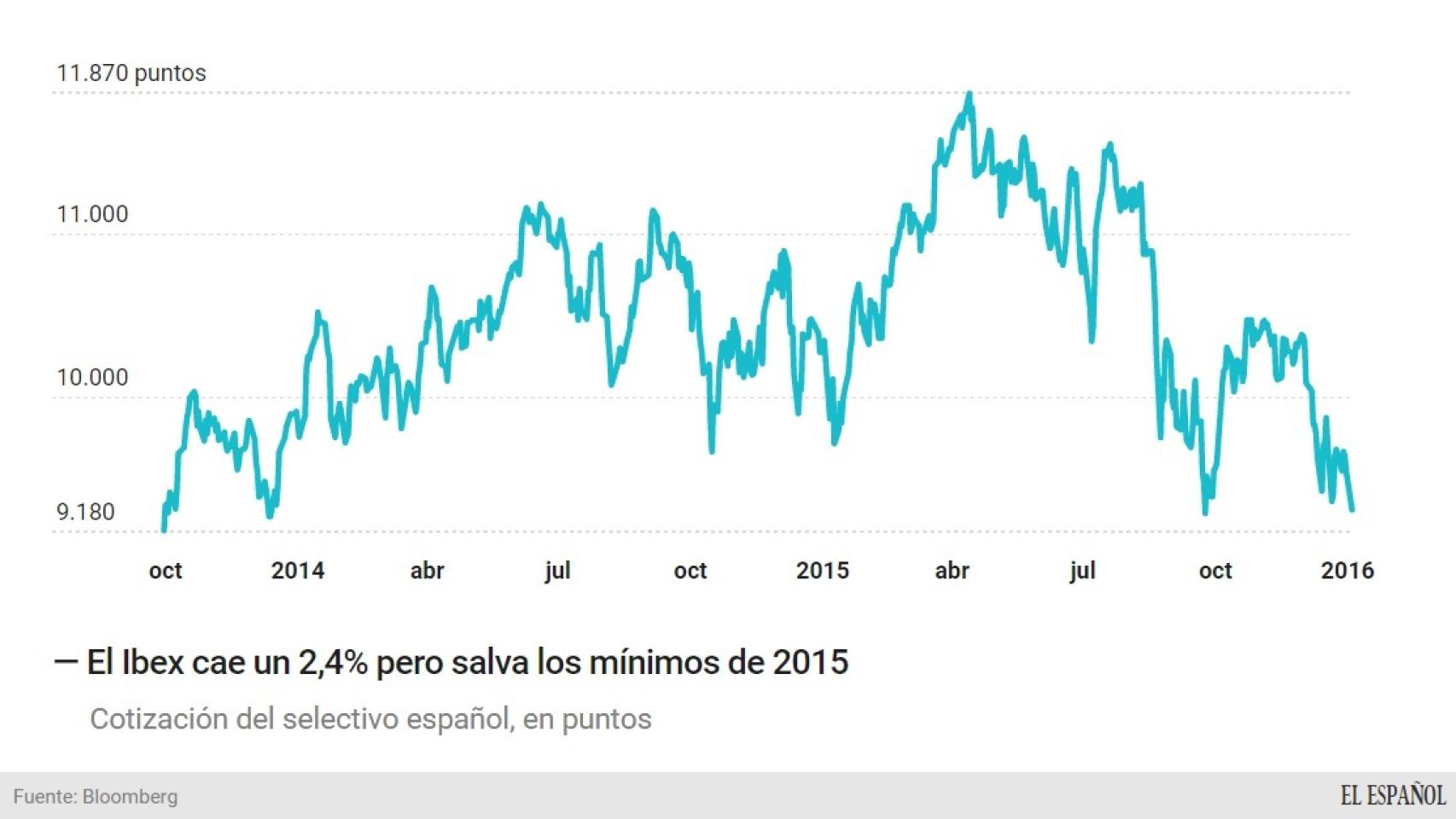 Sin embargo, el descenso del Ibex es más llamativo ya que vuelve a los mínimos del año pasado después de un 2015 muy negativo para la bolsa española. El resto de plazas europeas vivió un buen ejercicio, por lo que el descenso de hoy no marca mínimos relevantes.