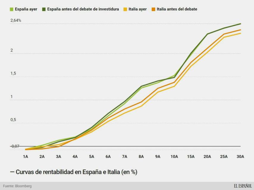 La curva de rentabilidades de la deuda española desde que fracasó el primer debate de investidura se ha mantenido plana. Algunos tramos han mejorado un poco, otros han empeorado, pero, en líneas generales, todo está bastante plano. Por el contrario, en Italia todos los tramos se han visto beneficiados, y en los más largos, con una caída media de hasta nueve puntos básicos.