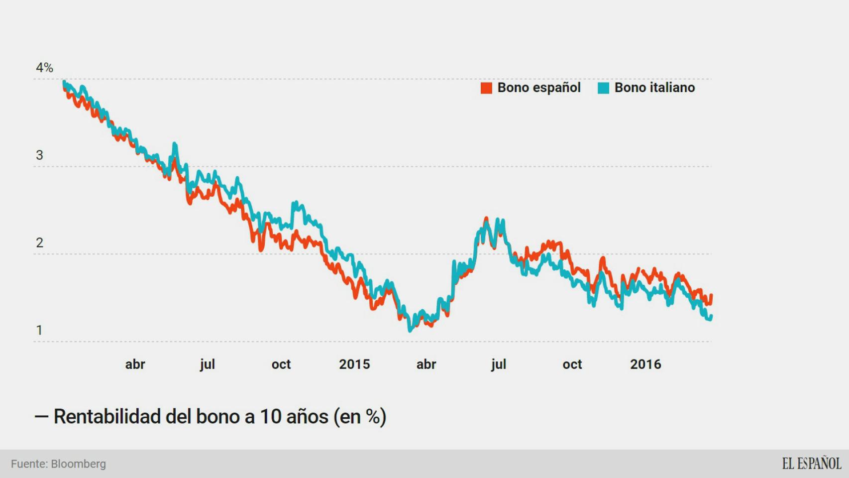 Entre 2014 y mediados de 2015, la prima de riesgo española estuvo casi de forma ininterrumpida por debajo de la italiana, esto es, la rentabilidad que exigía el mercado a la deuda española era menor. Este concepto, que puede parecer tan abstracto, significa simple y llanamente que a España le costaba menos financiar su deuda que a Italia. Una ventaja comparativa que ahora se ha convertido en lastre para España.