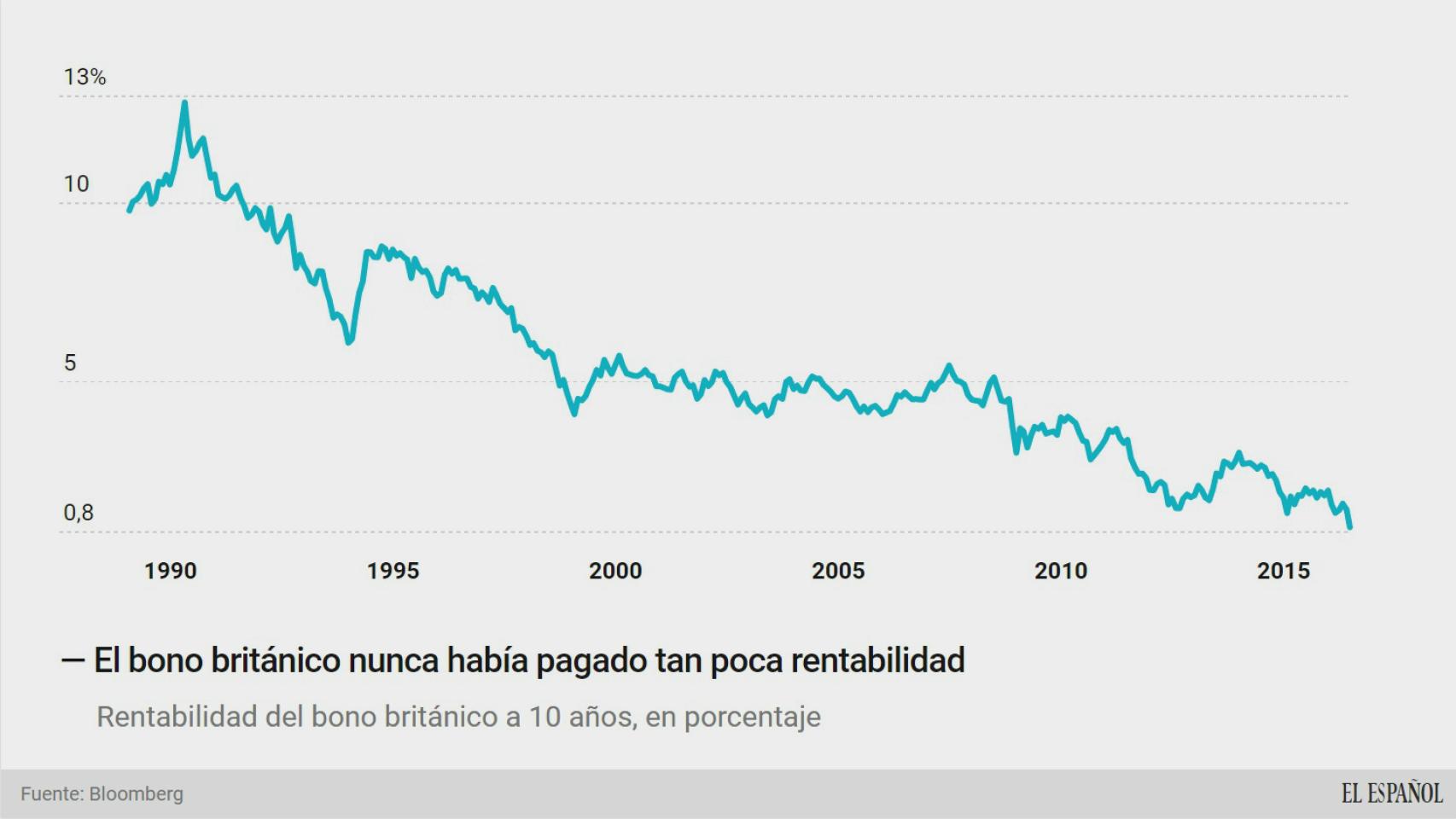 El lunes el Reino Unido amaneció con incertidumbre política por saber cómo será su desconexión de la Unión Europea, económica por ver cuál será su impacto y además la amenaza de perder la triple A de Standard & Poor’s (que finalmente la perdió al cierre de la sesión). Y, a pesar de todo, la rentabilidad del bono británico a 10 años (Gilt) se relajó hasta el nivel más bajo de su historia: por primera vez caía del 1%.