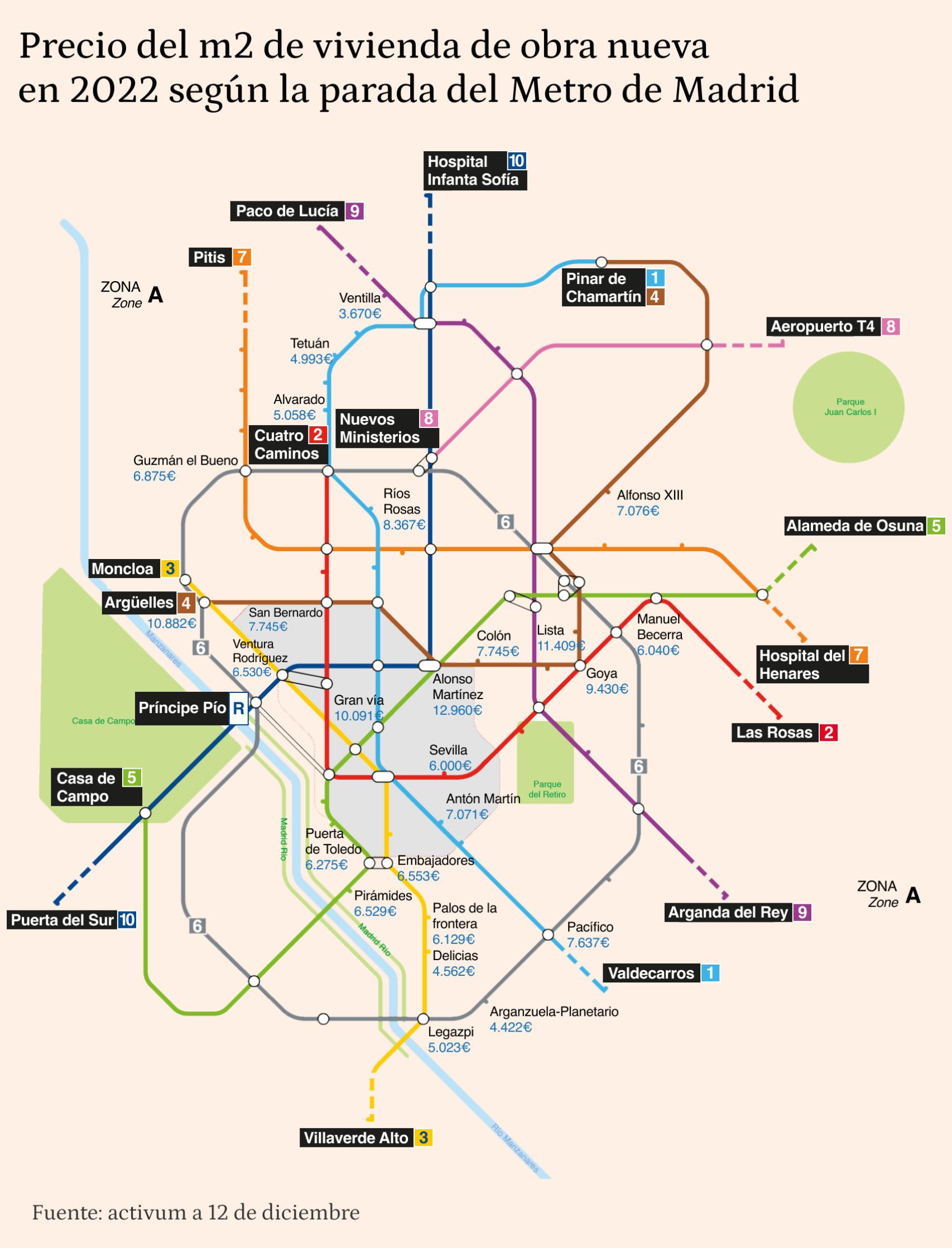 Si se pone el foco en aquellas estaciones con gran flujo de viajeros, el precio de la vivienda nueva en las cercanías de la estación de metro de Gran Vía es de 10.090,91 euros el metro cuadrado; Goya, 9.429,93 euros; Pacífico, 7.637,36 euros; Embajadores, 6.553,67 euros; y Legazpi, 5.022,94 euros.