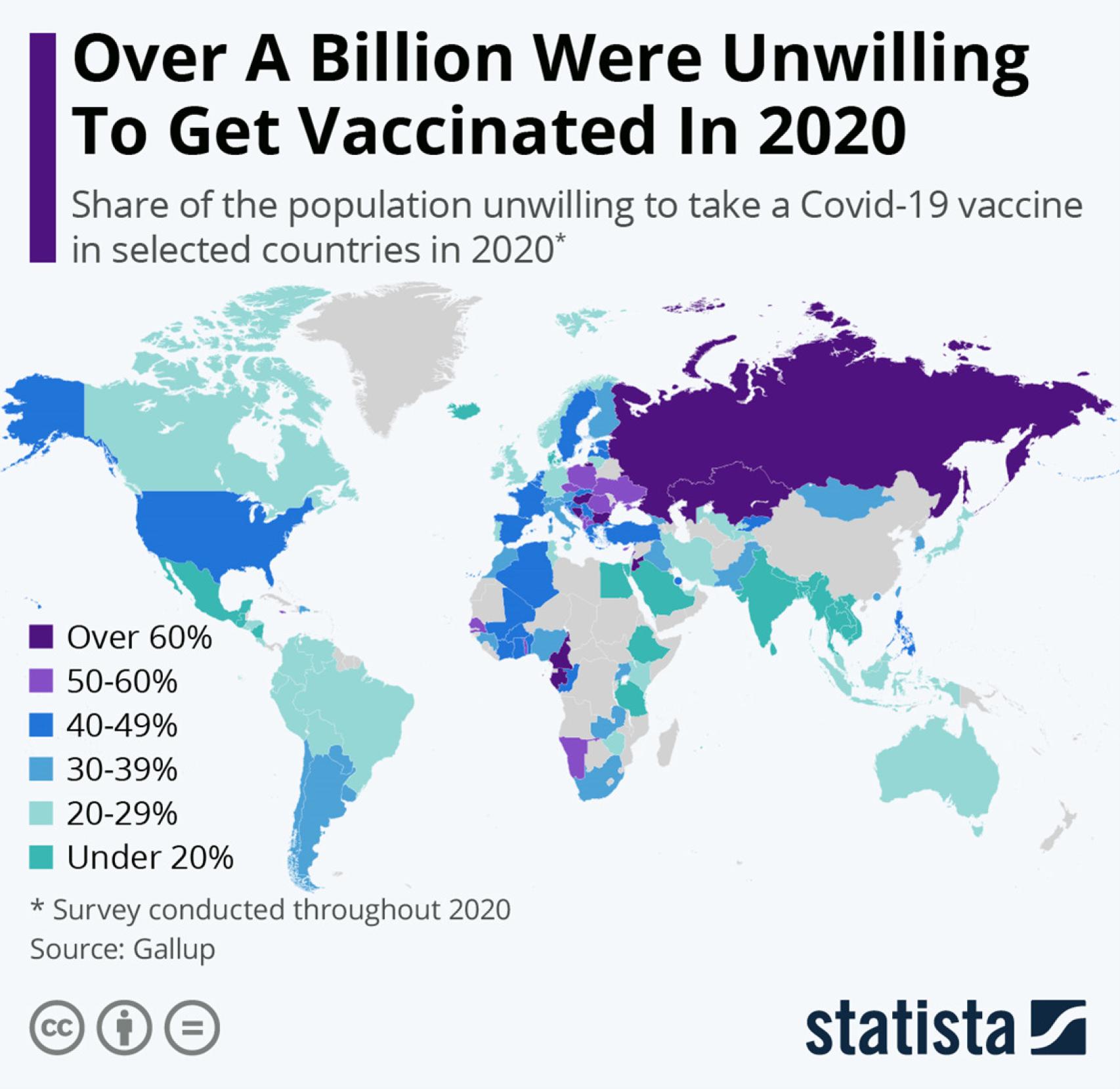 La mayoría rechazaría la vacuna en 20 países, principalmente en Europa del Este y África. En total, más de mil millones de personas no estaban dispuestas a vacunarse durante el primer año de la pandemia.