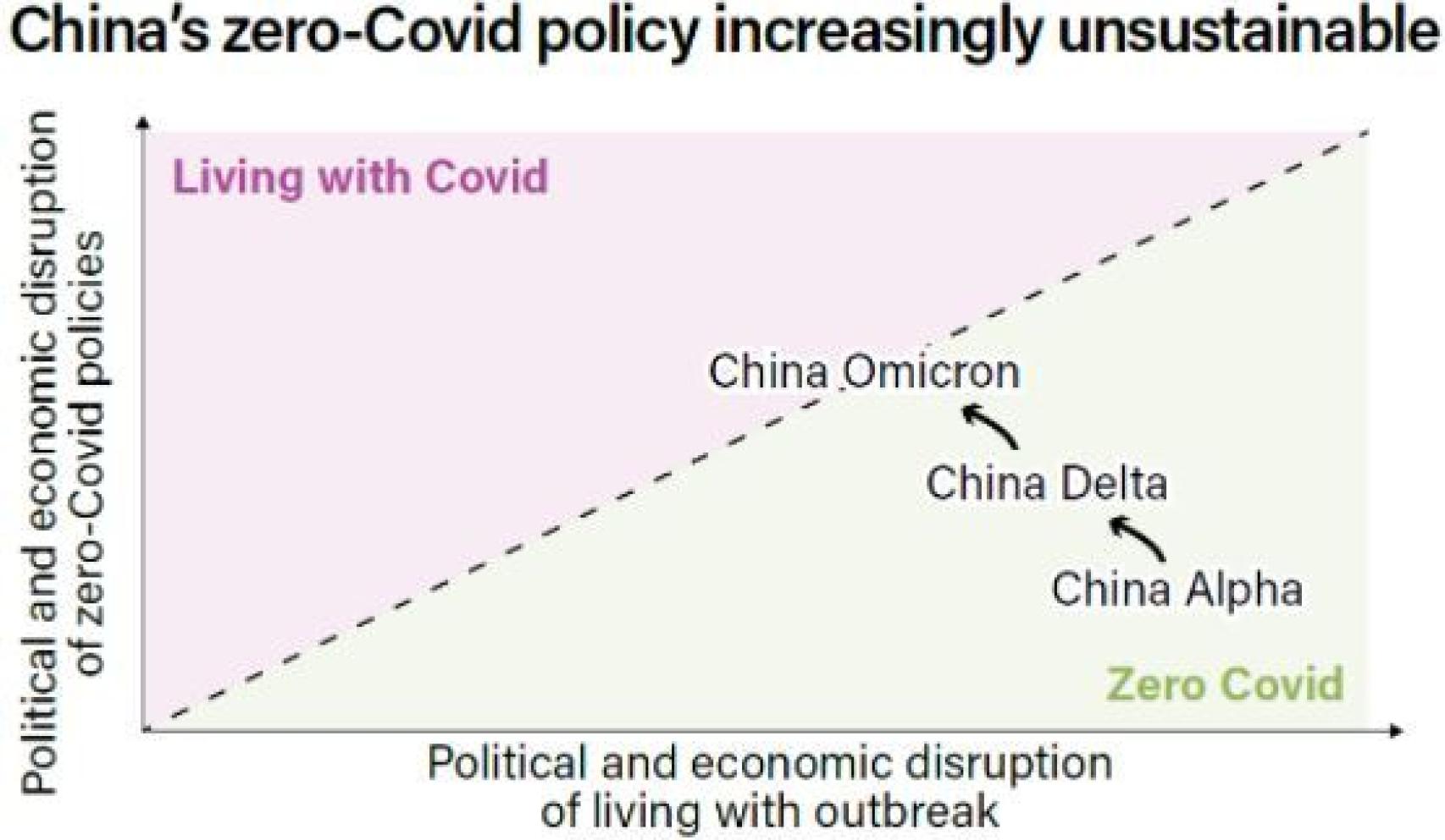 La política de China no podrá contener las infecciones y requerirá bloqueos severos. Esto generará trastornos económicos y más intervención estatal. El país se quedará atascado hasta que pueda implementar inyecciones de ARNm. Los problemas de China se suman a la interrupción de las cadenas de suministro, lo que presentará riesgos en todo el mundo: