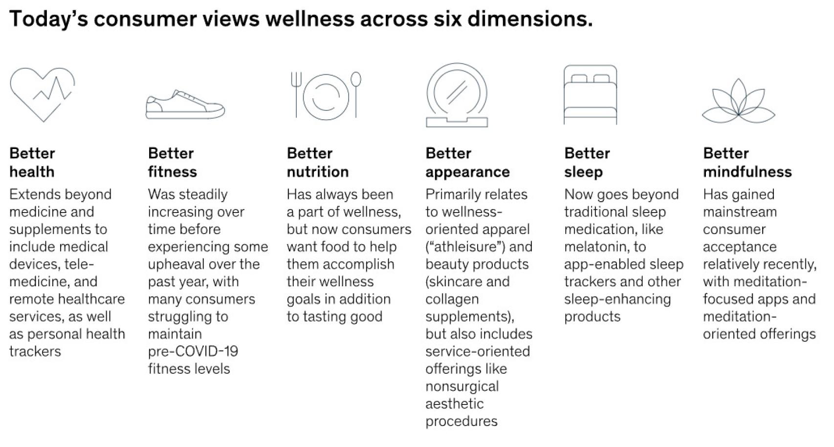 En su informe, la mencionada consultora dice que, en opinión de los consumidores, las principales categorías que definen este mercado son la salud, el estado físico, la nutrición, la apariencia, el sueño y la atención plena: