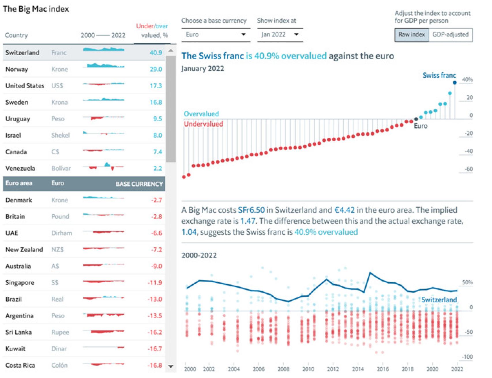 El índice ajustado al PIB per cápita es más apropiado para hacer predicciones, ya que aborda la cuestión de que los precios de las hamburguesas sean más bajos en los países pobres que en los ricos porque los costes laborales son menores. Señala hacia dónde deberían dirigirse los tipos de cambio a largo plazo.