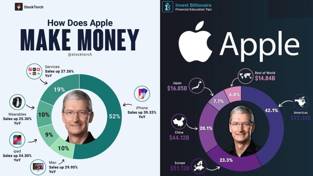 Por ello, me ha parecido interesante recopilar para hoy algunas infografías de Visual Capitalist, Invest Billionaire, Carbon Finance y StockTorch con objeto de revelar curiosidades acerca de cómo algunas de las empresas más importantes del mundo ganan dinero o dónde generan la facturación.