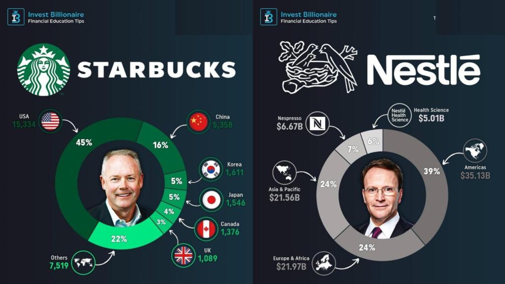 Starbucks genera casi la mitad de su facturación en su propio país. Sin embargo, Nestlé vende más al otro lado del Atlántico. La expansión de la multinacional suiza es francamente admirable y es de destacar su incipiente incursión en el sector de la salud: