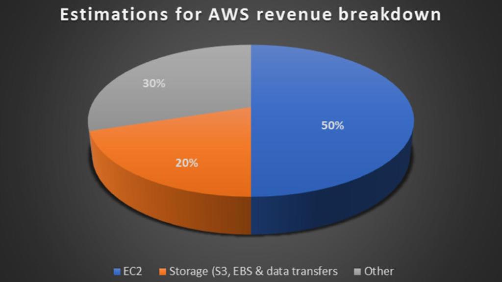 Se estima que el 70% de los ingresos de AWS provienen de la computación (EC2 es su producto) y del almacenamiento: