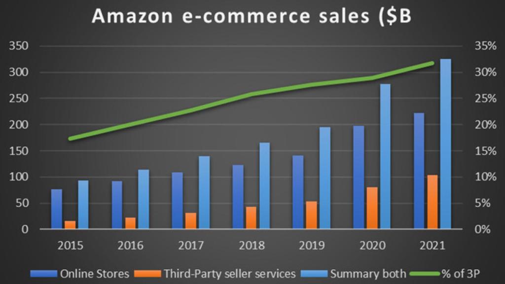 También se encargan del cumplimiento, del embalaje y del proceso de envío al cliente. Amazon se dio cuenta de que así no tenía que preocuparse por el inventario, la marca de los artículos, la calidad, lo que esté de moda, etc. Este enfoque ha ido creciendo y representando una parte cada vez mayor de sus ingresos por comercio electrónico: