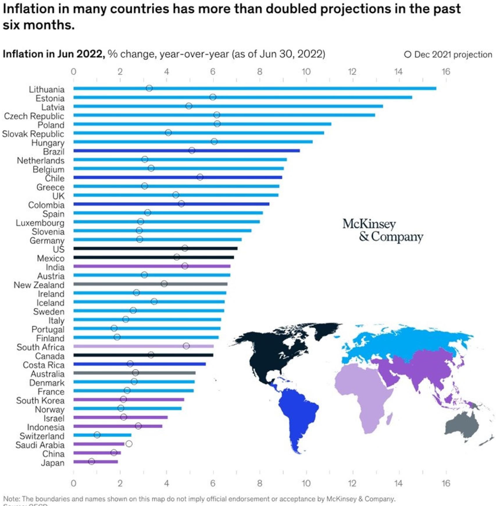 En esta infografía de McKinsey, se observa que, en muchos países de la OCDE, los datos registrados de inflación a mitad de año han más que duplicado las proyecciones realizadas a finales del año pasado: