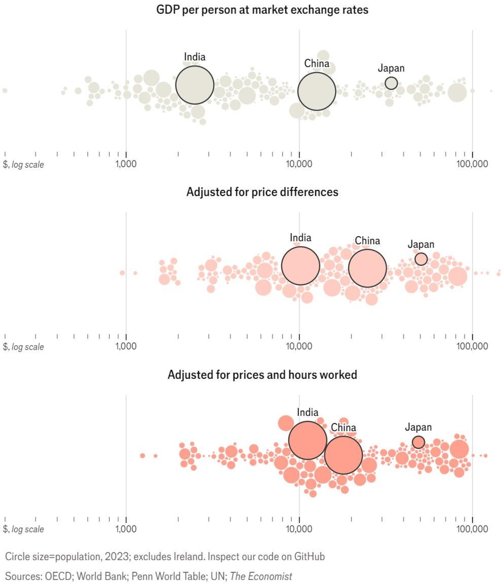 Para obtener una visión más completa, The Economist clasifica a los países según tres parámetros: ingresos en dólares per cápita, ingresos ajustados a los precios locales (paridad de poder adquisitivo o PPA) e ingresos por hora trabajada. El círculo más grueso a la derecha en cada parámetro es Estados Unidos: