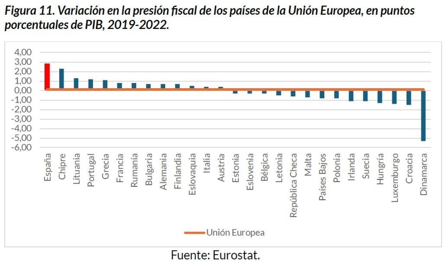 Lo cierto es que los países miembros de la UE apenas han aumentado los impuestos de 2019 a 2022. Sin embargo, España ha sido la nación con mayor incremento de la presión fiscal en dicho periodo, lo que ha contribuido a empeorar nuestro desempeño antes, durante y después de la pandemia, hasta el punto de que ocupamos el peor puesto del ranking: