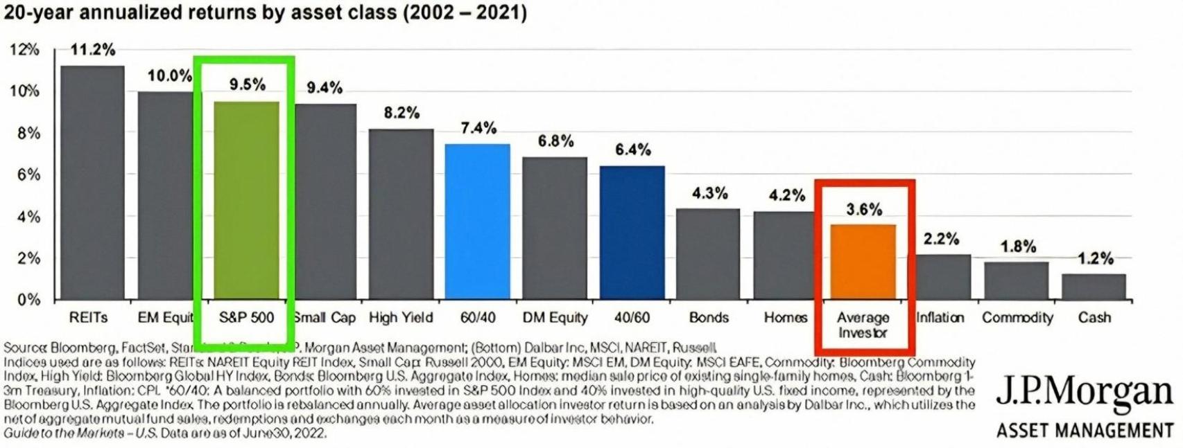 Centrándonos en la renta variable, este gráfico de JP Morgan deja claro que las viviendas han obtenido a largo plazo sólo la mitad de la rentabilidad de la bolsa (cuadro verde). Sin embargo, lo realmente relevante es que el inversor promedio (cuadro naranja) ha ganado incluso menos de la mitad.