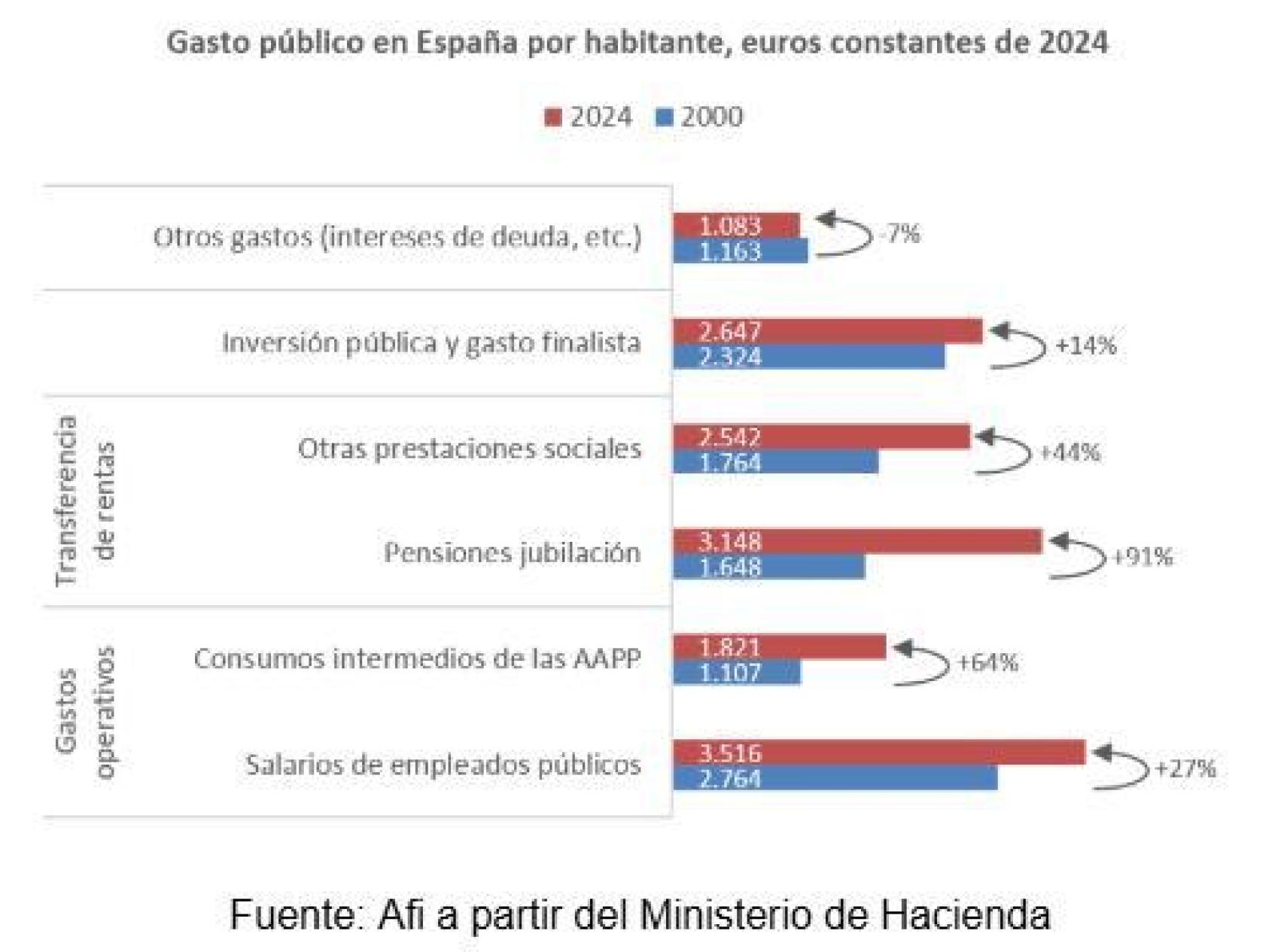 Así, en 2025, se destinaron 5.690 euros por persona a las transferencias públicas de renta, de los que 3.148 fueron pensiones de jubilación. Las transferencias de renta han crecido un 67% en términos reales entre 2000 y 2025 y ya suponen la primera partida de gasto público, equivalente al 39% del total.