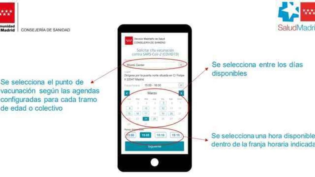 Una vez dentro de la aplicación o de la web de la Comunidad de Madrid, y si pertenece a la franja de edad de vacunación, podrá elegir, día, hora y lugar para ser vacunado.