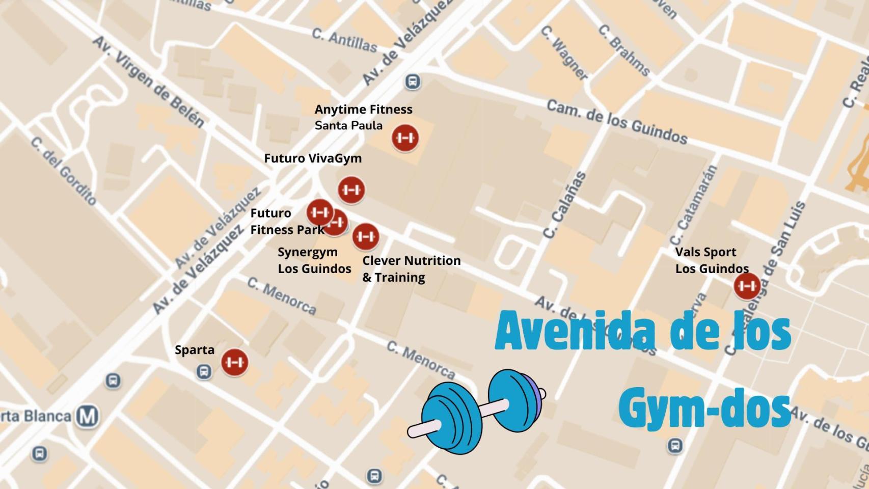 Si el músculo tuviera su propio distrito en Málaga, estaría claro dónde marcar el mapa. La avenida de los Guindos, en el distrito Carretera de Cádiz, está a un paso de volver a ser bautizada y convertirse en la nueva avenida de 'los Gym-dos'. En apenas medio kilómetro de distancia, tres conviven, se observan y compiten por los mismos clientes llegando a convertir la vía en una especie de milla del fitness a la malagueña. A ellos hay que sumar otros dos que se están construyendo y otro par que se encuentra en los alrededores.