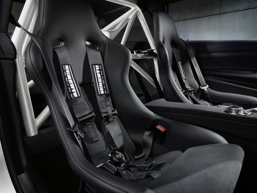 En el interior, los dos asientos son bacquets de carbono cubiertos en Alcántara y cuero Meriono, con un volante M Sport. Se ha suprimido la banqueta trasera y se ha instalado una jaula antivuelco de color blanco. Dispondrá del sistema de navegación de BMW Professional, aire acondicionado, luces LED adaptativas frontales con el sistema BMW Selective Beam, y luces de tecnología OLED en la parte trasera. También llevará sensores de aparcamiento delantero y trasero.