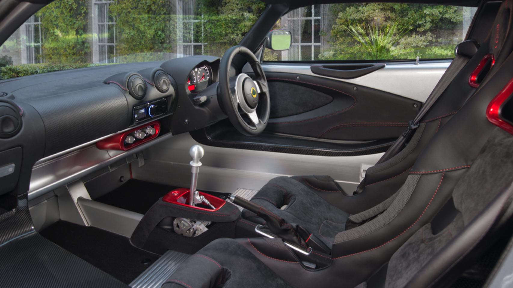 Cabe destacar la presencia de una caja de cambios manual con parte del mecanismo abierto y visible en el habitáculo, así como diversas piezas metálicas con una terminación adonizada en color rojo. Como es habitual en los Lotus más deportivos, el habitáculo está prácticamente desnudo, sin moquetas ni molduras superfluas, lo que deja ver por ejemplo diversos paneles metálicos en el suelo.