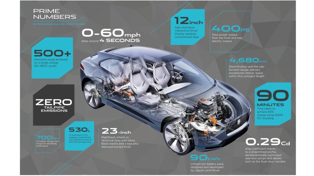 El I-Pace Concept se presenta con unas acreditaciones que lo colocan como un claro rival de las últimas creaciones de Tesla, con un habitáculo vanguardista diseñado para cinco ocupantes, 530 litros de maletero, 400 CV de potencia, 700 NM de par y la capacidad, gracias a su tracción integral, de acelerar de 0 a 100 km/h en aproximadamente 4 segundos.