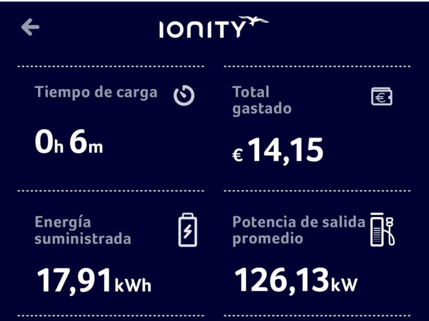 En este sentido, además, desde Ionity nos recuerdan que si somos usuarios frecuentes del coche eléctrico, nos conviene suscribirnos al Ionity Passport, que por una cuota de 17,99 euros al mes, el kWh costaría 0,35 euros. Por tanto, esta carga nos habría costado 6,29 euros, casi 8 euros menos. Por tanto, con dos o tres cargas al mes, sería más que interesante esta última opción de estar suscritos.