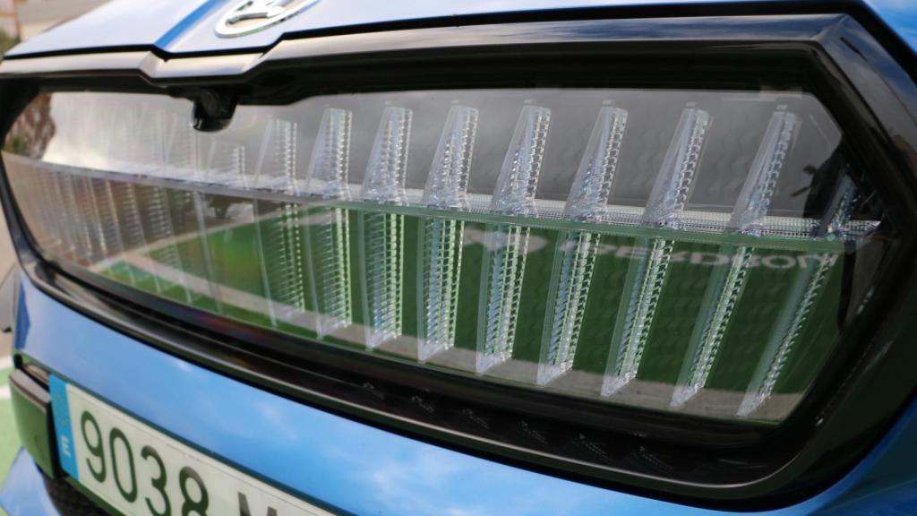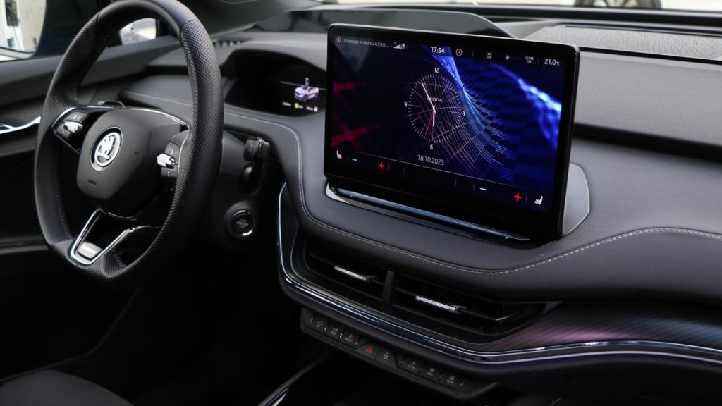 Y, de ahí, que Skoda haya incluido en el frontal esta parrilla transparente. Después, el segundo elemento característico es la trasera, con un techo descendiente y gran portón. Esta trasera es especialmente llamativa y, tal y como hemos señalado, nos recuerda mucho al Cupra Tavascan. Continuando con el interior, destacamos especialmente la pantalla central multimedia de 13 pulgadas, si bien a cambio el cuadro de instrumentos digital es muy pequeño. Como contrapartida, los acabados y los ajustes son buenos.