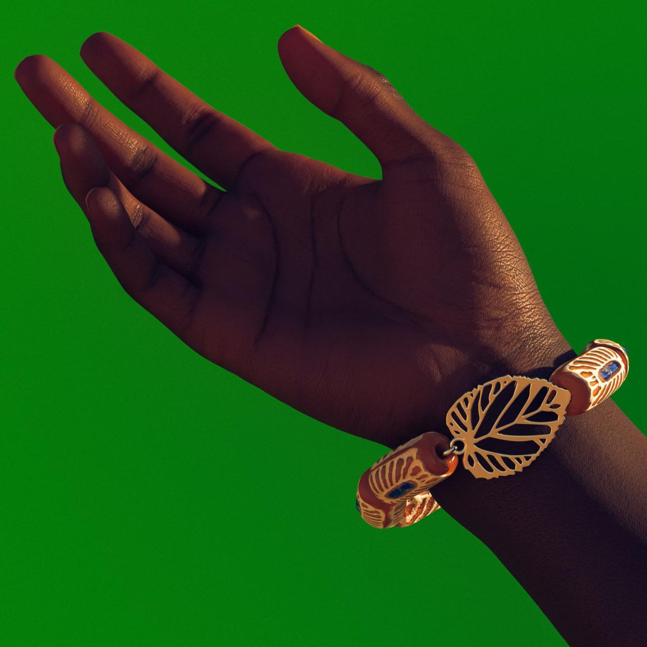 La línea, ideada con el equipo local de artistas, diseñadores y artesanos de la creadora, se inspira en las comunidades agrícolas de cacao. Sus prendas, versátiles, se pueden combinar y adaptar a diferentes estilos. Incluye una falda, una capa, un pañuelo grande (que puede llevarse como top o pañuelo para la cabeza), un pañuelo accesorio más pequeño y una pulsera de plata fundida. Todos los complementos cuentan con un estampado diseñado en exclusiva por Rebecca.