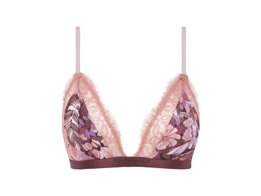 Este sujetador triangular natural, en un precioso color rosa, con detalle de encaje floral y detalles de microfibra, también nos enamora por su comodidad. No tiene ni aros ni relleno (11,99 euros).