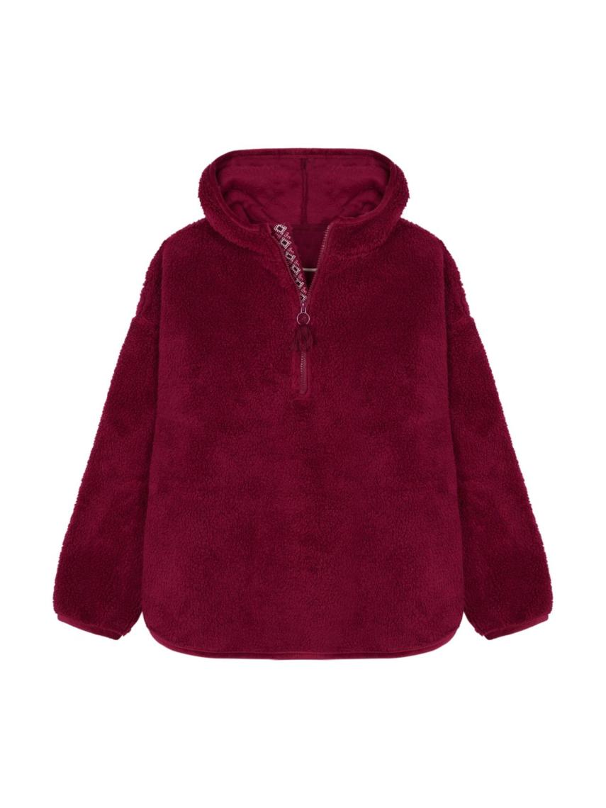 Encontramos prendas como esta sudadera con tejido polar sherpa en un liso color rosa frambuesa. Muy calentita y cómoda, querrás lucirla para estar en casa o como sudadera en tus looks de calle más relajados. Cuenta además con detalles de pasamanería en el interior y tirador con pompón para darle un toque más especial (14,99 €).