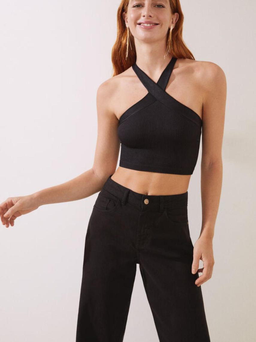 Destaca esta propuesta con cuello halter y de tipo seamless (sin costuras) confeccionado en canalé en un clásico color negro. Atemporal, elegante y muy cómodo (10,99 €).